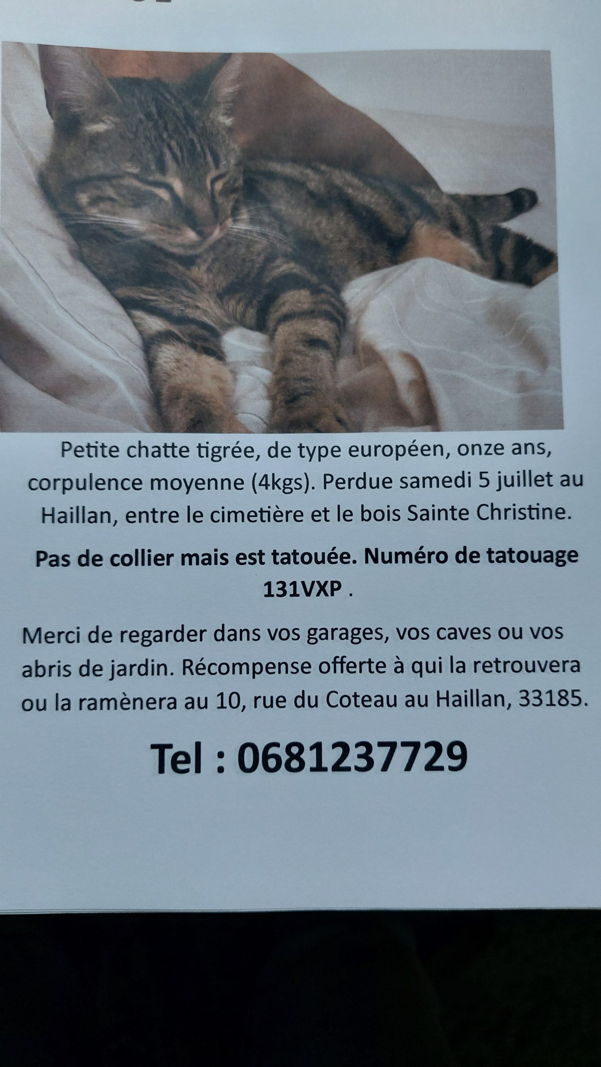 Signe distinctif : petit ventre beige qui pend un peu. Plutôt câliné d’habitude, mais décrite comme apeurée par ceux qui l’ont aperçue.